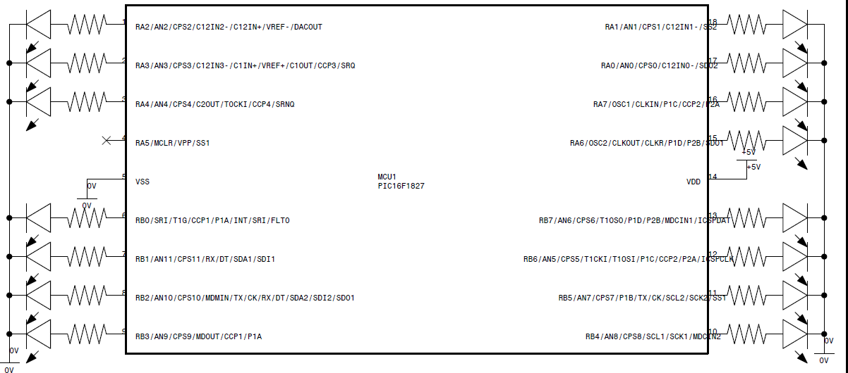Here's the schematic for the cascading lights circuit. As you can see it's just one MCU and LEDs on all the pins except for pin#4 (RA5) which is an input-only pin. Resistors can be as low as, oh about, 180 ohms for a power supply of 5 volts. You have to watch out for the maximum rating of each pin (25mA if I remember correctly) and the maximum for each PORT.