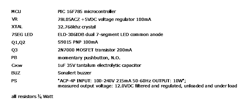 Upon power up, the MCU will be in Standby mode and 2-digit seven-segment LED display will read 0. If PB is momentarily pressed a 7ms beep will sound and the LED display will read 1. Because of the limitations of the display, the maximum number of minutes the system will accommodate is 99 minutes.